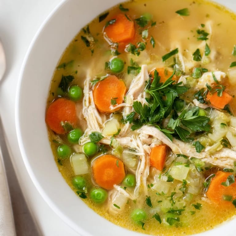 Save Last Tuesday, I stood in my kitchen watching rain streak down the windows, craving something that felt like a promise of warmer days ahead. I'd just come back from the farmers market with a bag full of bright green peas and the sweetest carrots I'd seen all season. This soup ended up being exactly what I needed—light enough that I didn't feel weighed down, but satisfying enough that I went back for seconds. Something about that first spoonful, with the tender chicken and vegetables swimming in the fragrant broth, made the whole house feel cozier.