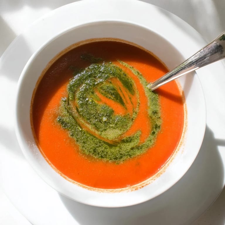 Save My kitchen smelled like summer even though it was pouring rain outside. I had a pile of tomatoes from the farmers market that were starting to slump on the counter, and I wanted something warm but bright. The pesto was a last-minute idea, something I threw together while the soup bubbled away, and that green swirl turned a simple pot of soup into something I actually got excited about eating. Sometimes the best recipes are the ones you half-invent out of necessity.